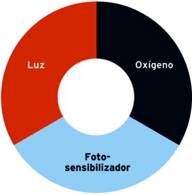 La TFD necesita tres componentes: un fotosensibilizador, luz con una longitud de onda adecuada y oxígeno (véase la fig. 1)7,8.