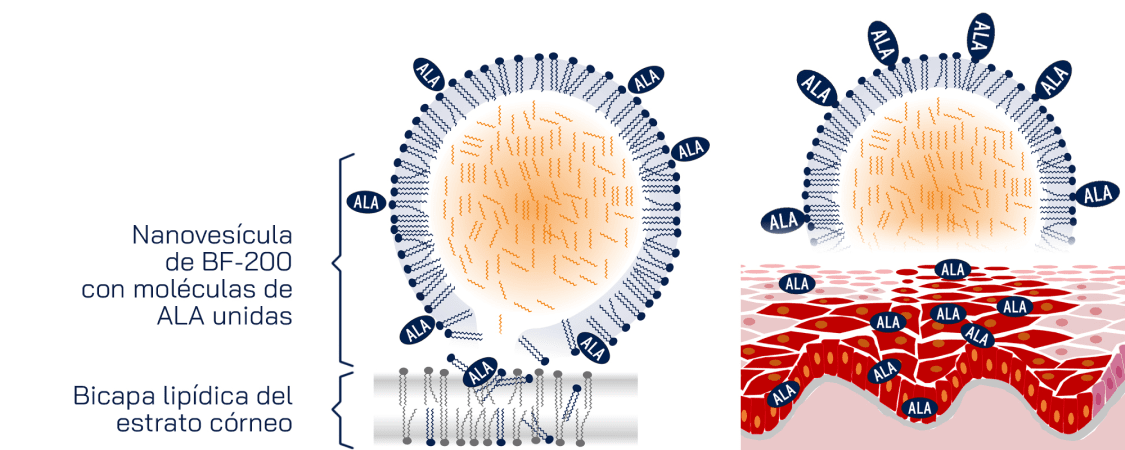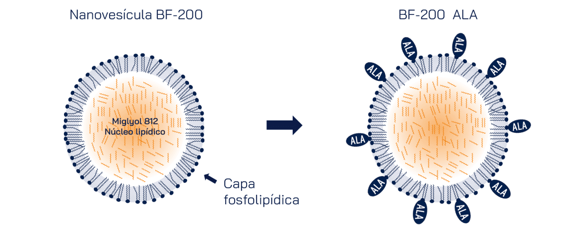 La nanoemulsión patentada BF-200 pertenece al grupo de las microemulsiones, que se utilizan ampliamente en medicamentos y productos para el cuidado de la piel. BF-200 es una emulsión de aceite en agua: la fase oleosa está formada por una gran cantidad de pequeñas vesículas con diámetro nanométrico (aprox. 15-30 nm), que se disuelven en la fase acuosa. Las vesículas constan de un núcleo lipídico líquido, envuelto en una capa única de fosfolípidos.