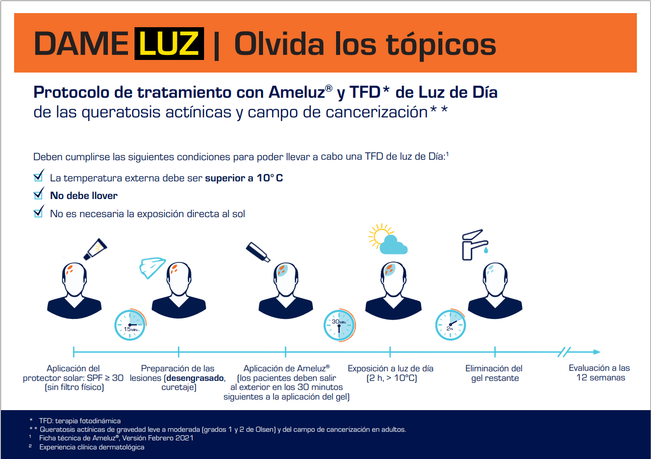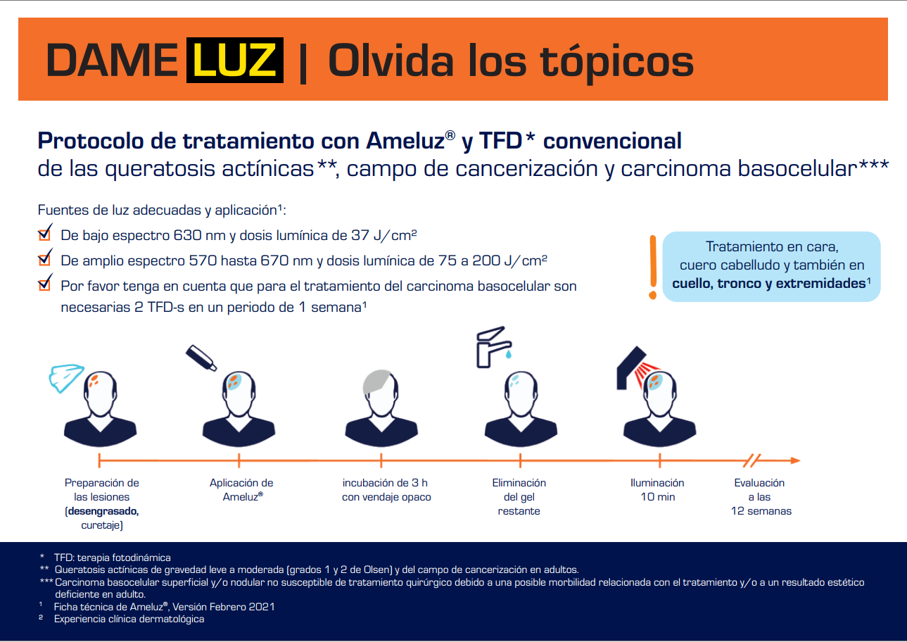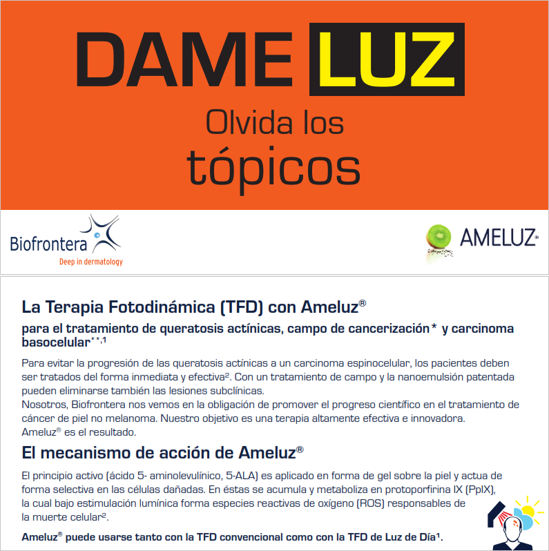 PRESENTACIÓN Y PRECIO: Ameluz 78 mg/g gel. 1 envase de 2g: PVP: 195,91 €; PVP (IVA 4%): 203,75 €. RÉGIMEN DE PRESCRIPCIÓN Y DISPENSACIÓN. Medicamento sujeto a prescripción médica. Financiado por el SNS. CONSULTE LA FICHA TÉCNICA COMPLETA ANTES DE PRESCRIBIR.